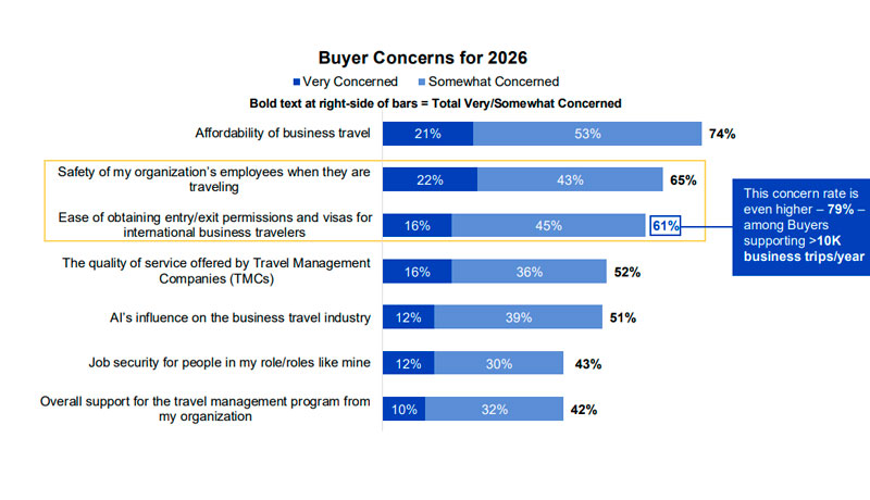 Entre las organizaciones que envían empleados con frecuencia a Estados Unidos, tres de cada cuatro se declaran muy (42 %) o bastante (36 %) preocupadas. Las principales inquietudes se centran en la gestión de los viajes a EE. UU. (65 %), el aumento de la complejidad operativa (64 %), los costes (63 %), la disposición de los empleados a viajar (61 %) y las dificultades para organizar reuniones en el país (53 %).