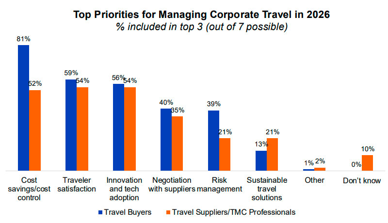 Más de la mitad de los compradores (52 %) se muestra preocupada por la calidad del servicio de las TMCs, aunque solo el 42% señala como problema el apoyo interno al programa de viajes. Entre los proveedores, el 45 % teme una mayor disposición de las empresas a cambiar de socios o TMCs en 2026.