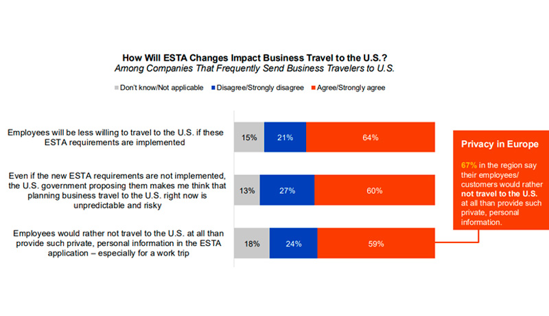 En Europa, la privacidad es un factor clave: dos de cada tres profesionales europeos (67 %) creen que sus empleados preferirían no viajar a Estados Unidos antes que facilitar este tipo de información personal. Como consecuencia, muchas empresas consideran celebrar más reuniones fuera de EE. UU. (43 %), reducir los viajes a corto (29 %) y largo plazo (25 %) o modificar sus políticas para limitar los desplazamientos al país (19 %).