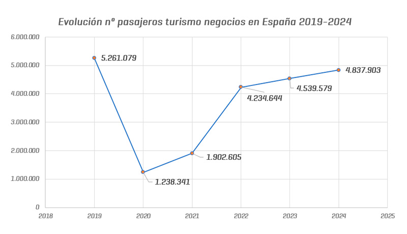 Durante 2024, 4,8 millones de viajeros internacionales visitaron España por motivos profesionales, una cifra que aún no alcanza los niveles previos a la pandemia. Sin embargo, el comportamiento del gasto refleja una clara recuperación cualitativa. El gasto medio por viaje se situó en 1.392 euros, mientras que el gasto diario alcanzó los 248 euros, el más alto de toda la serie histórica y cerca de un 30 % superior al del turismo vacacional.