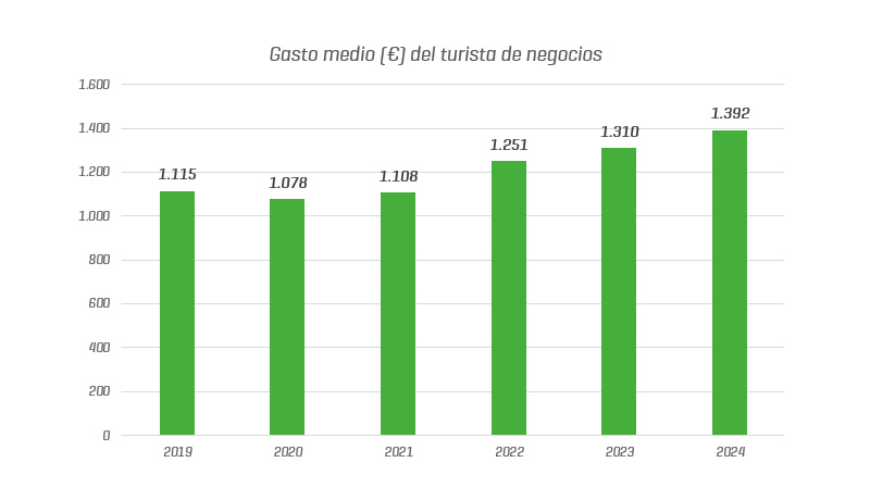 Dentro del viaje de negocios, el turismo de reuniones e incentivos (MICE) se consolida como el segmento de mayor valor añadido. En 2024, generó un gasto total estimado de 1.126 millones de euros, con un gasto medio por viaje de 1.457 euros y un gasto diario de 303 euros, el más elevado registrado hasta la fecha.