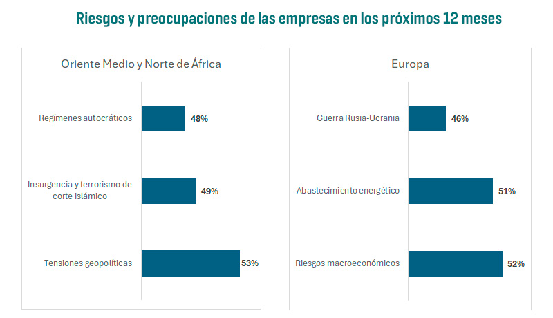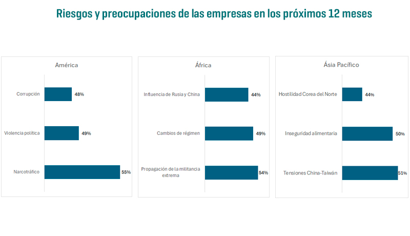 Para terminar este artículo, vamos a ver cuáles son los principales riesgos y situaciones que más preocupan a las organizaciones, en una visión por cada región geográfica en los próximos 12 meses.