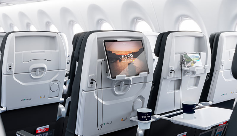 Los asientos son los más anchos del mercado (48 cm) y su reclinación ajustable es de 118º. Los reposacabezas ajustables, la tapicería de cuero y las espumas ergonómicas aumentan la comodidad respecto a sus predecesores. Los pasajeros también se beneficiarán de tomas USB A y C individuales y un soporte para tabletas o smartphones integrado en el respaldo.