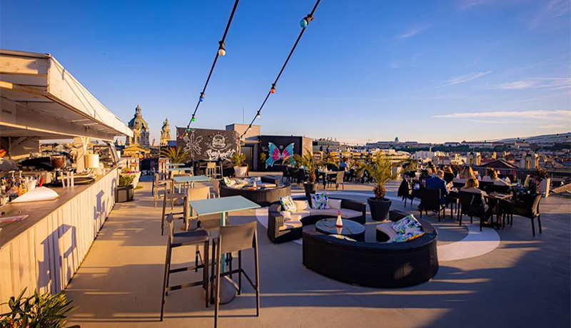 La oferta gastronómica del hotel se articula en torno al Intermezzo Restaurant and Café, situado en el rooftop del edificio, donde se reinterpretan platos de la cocina húngara con un enfoque contemporáneo y productos de inspiración local.