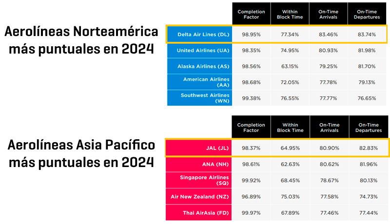 Delta Air Lines continuó dominando en América del Norte, mientras que Copa Airlines lo hizo en América Latina. FlySafair también ganó el premio a la aerolínea más puntual en Medio Oriente y África. En Asia-Pacífico, la mejor compañía fue Japan Airlines.