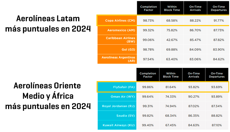 Delta Air Lines continuó dominando en América del Norte, mientras que Copa Airlines lo hizo en América LatinaFlySafair también ganó el premio a la aerolínea más puntual en Medio Oriente y África. En Asia-Pacífico, la mejor compañía fue Japan Airlines.