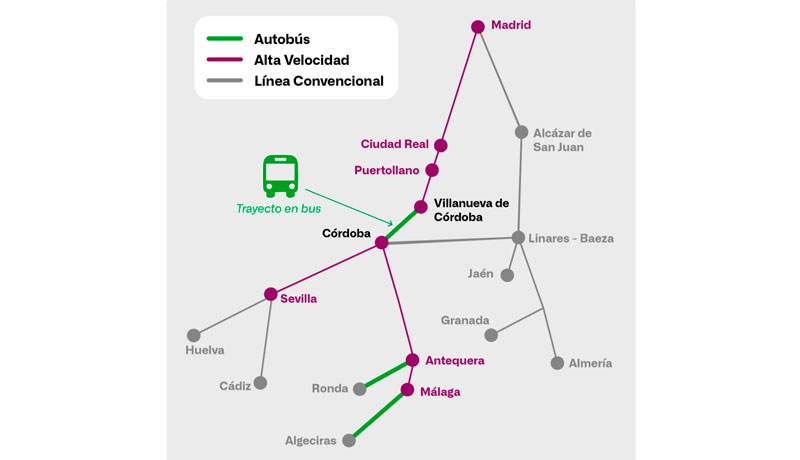 El plan alternativo incluye servicios especiales que combinan trayectos en tren con un tramo por carretera en autobús entre Córdoba y Villanueva de Córdoba, en ambos sentidos, lo que implica un aumento de los tiempos de viaje.